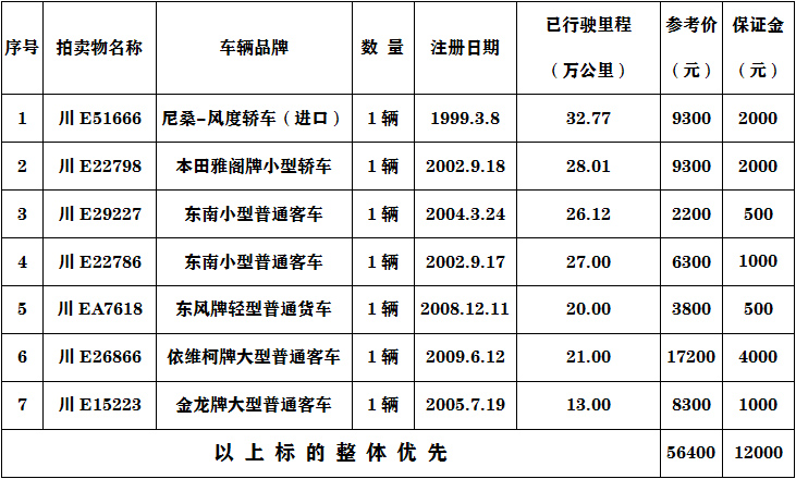 五、凡有意競(jìng)買者請(qǐng)于2020年3月26日16:00時(shí)前將保證金匯入本公司指定賬戶(保證金以到賬為準(zhǔn)),并于2020年3月26日16:00時(shí)前持匯款依據(jù)及有效證件到拍賣會(huì)地點(diǎn)辦理競(jìng)買手續(xù)。如成功競(jìng)買后,保證金沖抵成交價(jià)款,未能競(jìng)買成功,保證金全額無(wú)息退還,(保證金賬戶名稱:瀘州市四方拍賣有限公司,賬號(hào):51001637708051501502,開戶行:建行瀘州世紀(jì)城支行)